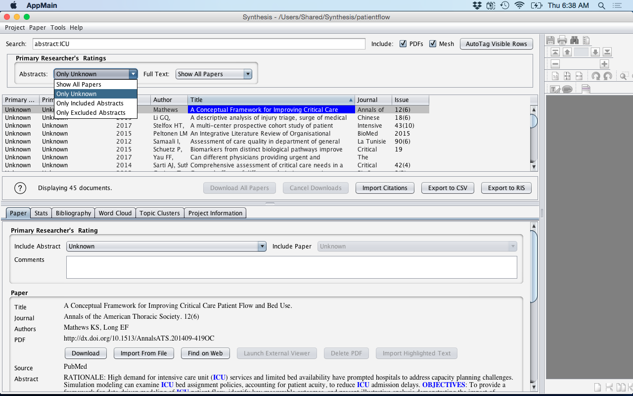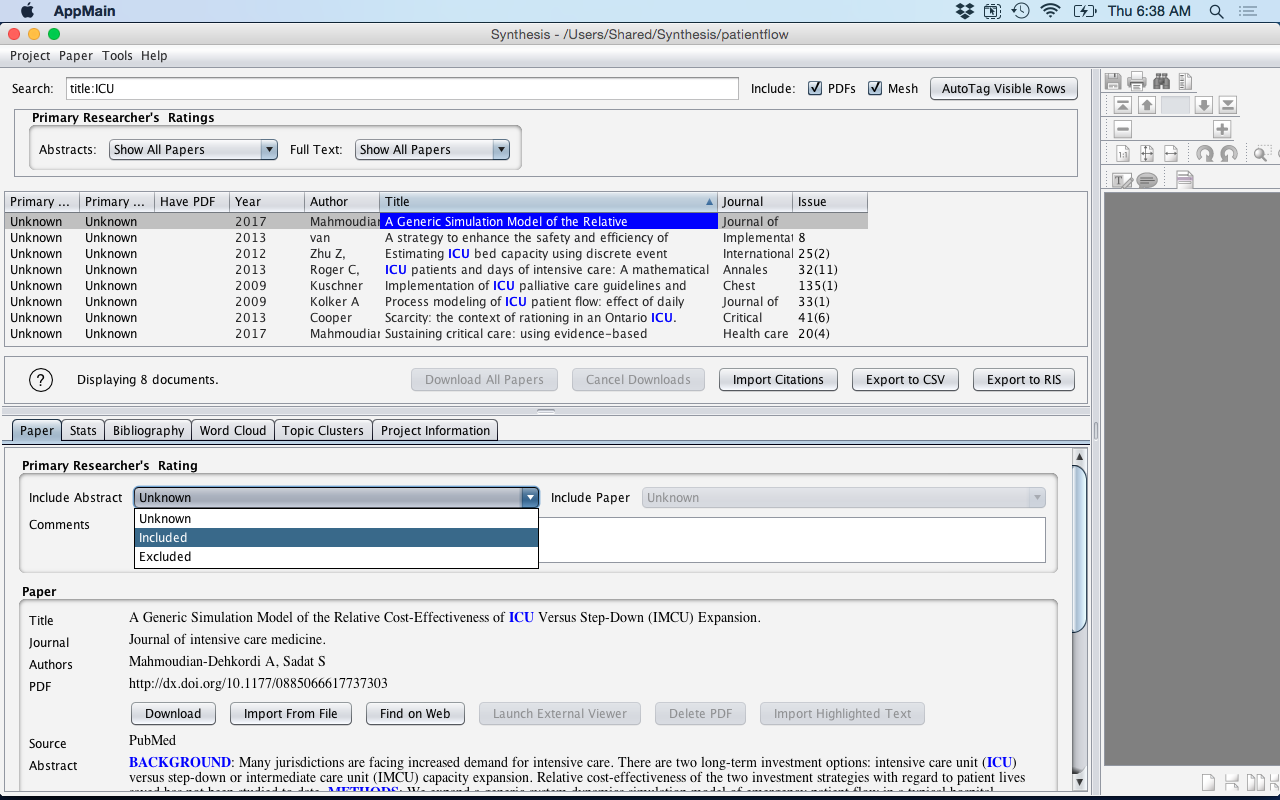 - Inclusion/Exclusion criteria can be applied by either going into the Paper Tab and using the Include Abstract drop-down menu and selecting Include or Excluded. All references start out in Synthesis as Unknown.