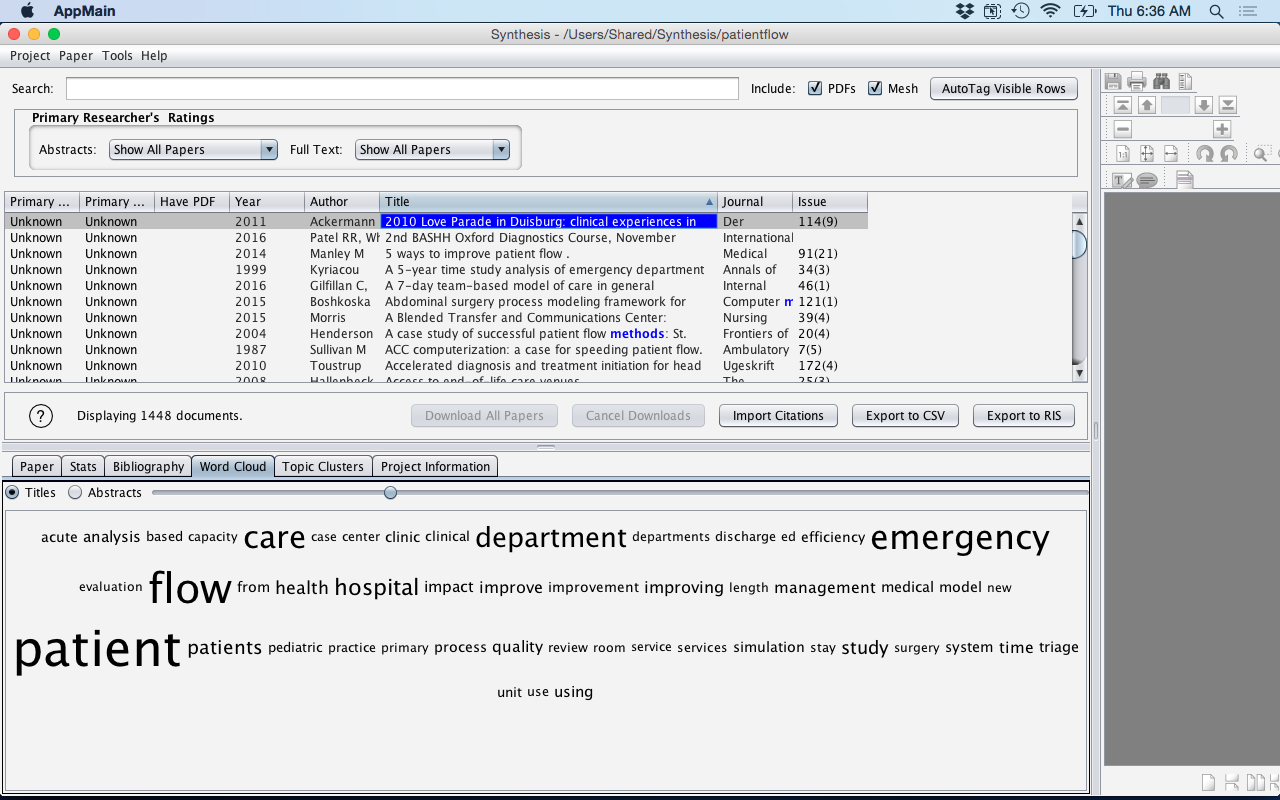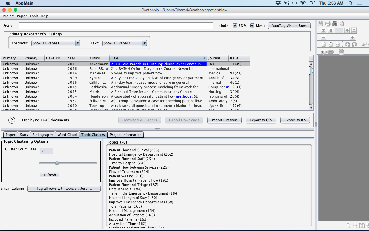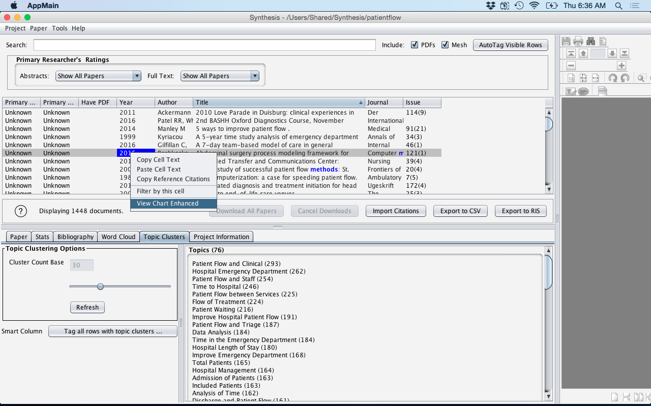 Once the references have been imported, the next stage is to examine the references to get an overview of the literature. This can be accomploished by examining summary statistics of the references, Word Clouds of the title and abstract, Topic Clustering, and Enhanced Charts.