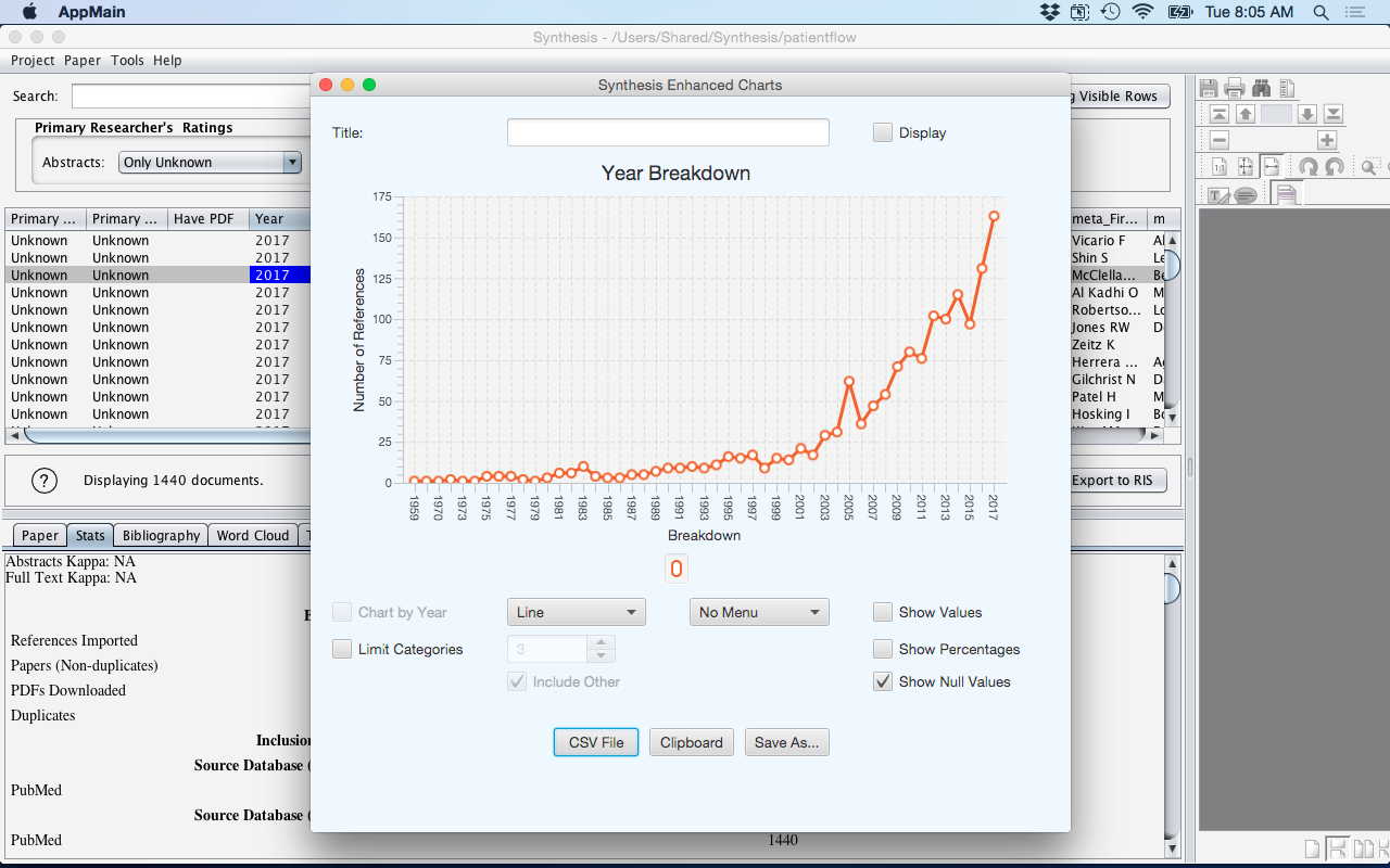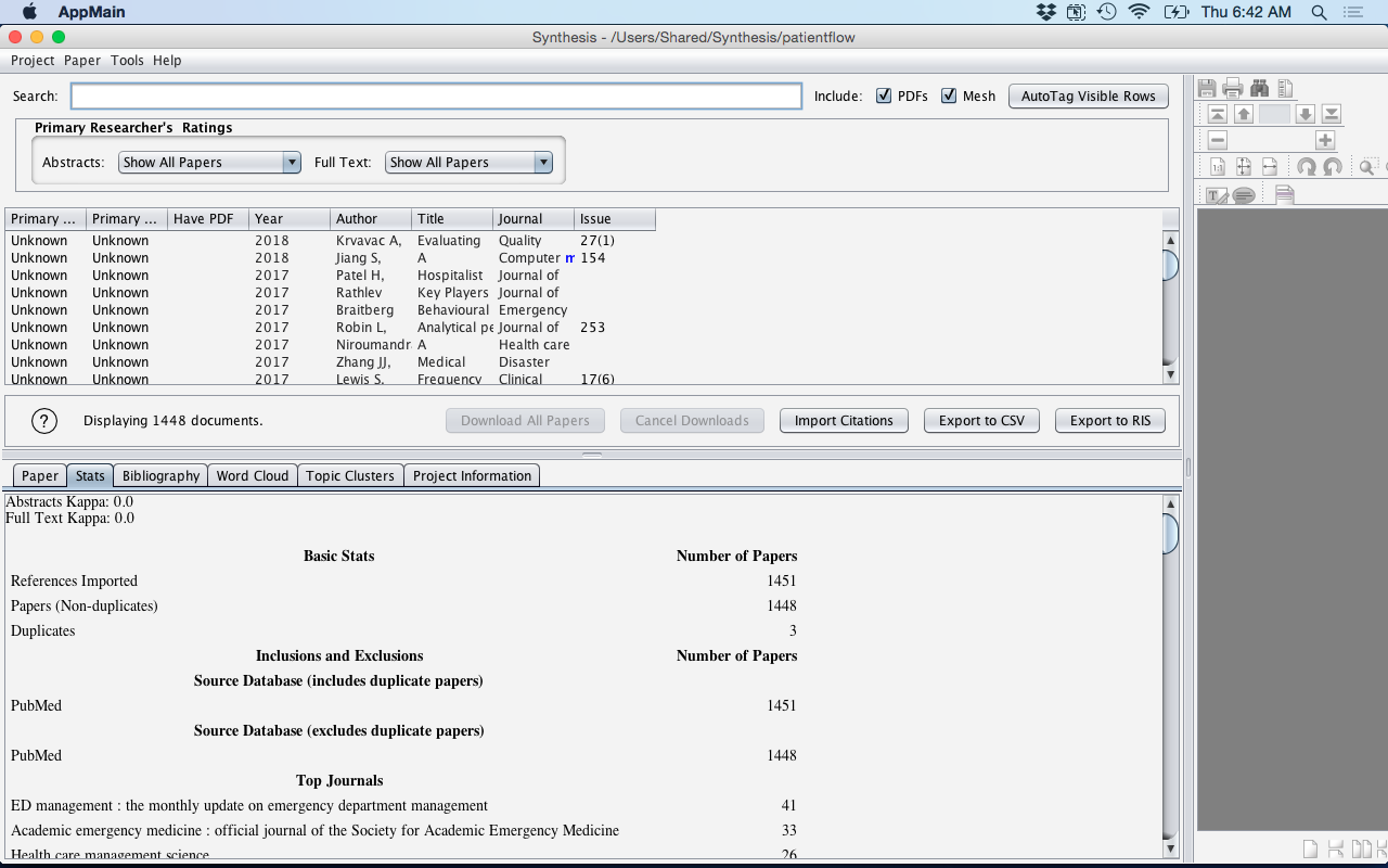 - The Stats Tab provides a high level summary of the references, including how many were imported, how many duplicates, which bibliographic data sources, inclusion/exclusion status, top 20 journals, top 20 subject (MeSH) headings, and references by year.